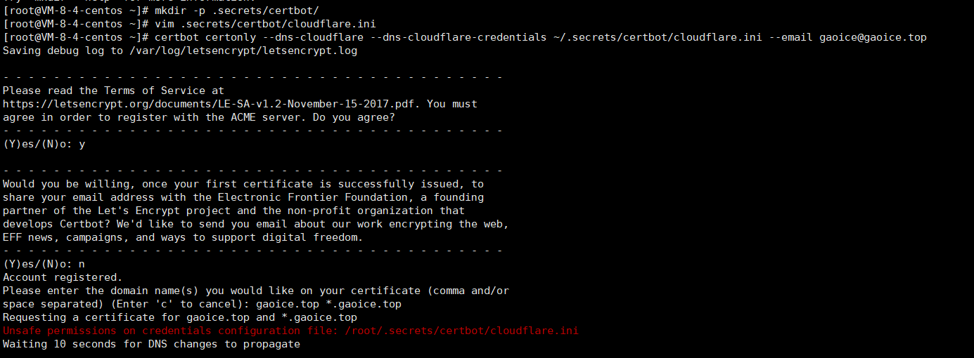 上面的命令中username@your.email换成你自己的邮箱,首次运行它会问你同不同意用户协议,然后问你要不要跟他们分享你的邮箱地址,用户协议得同意才能继续,而分享邮箱就看你自己了,后面同一个邮箱再次运行就不会问这些,问完之后会让你输入域名,可以输入多个域名,用空格分割,支持通配符域名