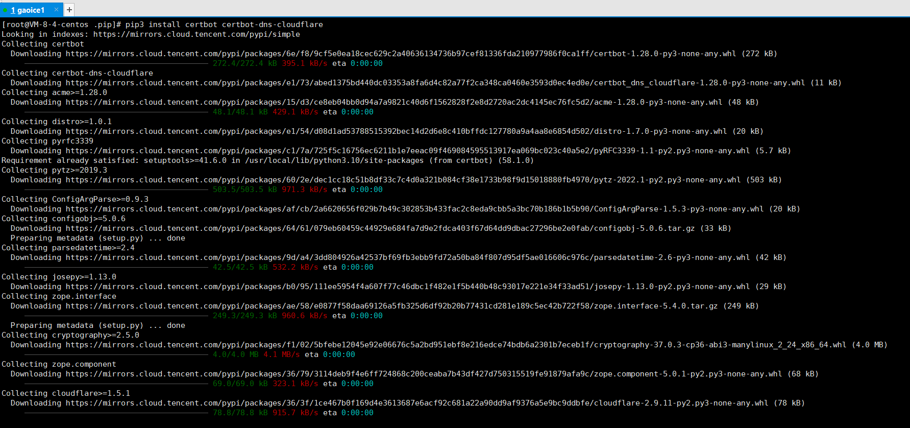 完成换源之后使用pip3 install certbot certbot-dns-cloudflare命令安装certbot和它的cloudflare dns插件