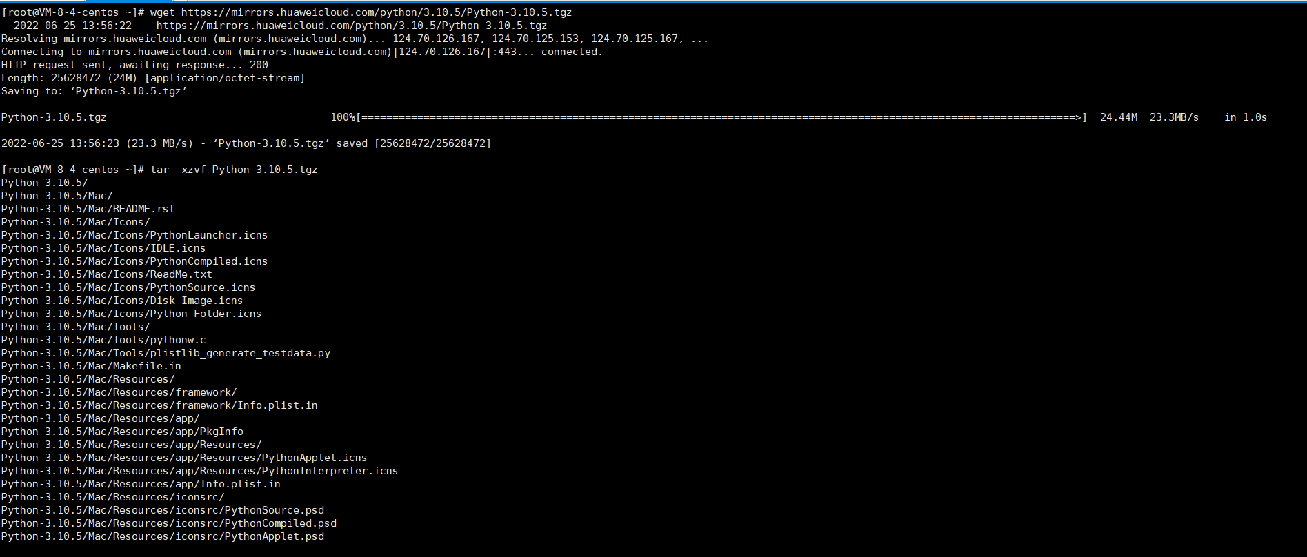 然后检查有没有安装到gcc、zlib-devel、bzip2-devel、openssl-devel、ncurses-devel、sqlite-devel、readline-devel、tk-devel、gdbm-devel、xz-devel、libffi-devel这些编译所需要的软件包,如果没有,自行使用yum命令安装,具体可参考这篇文档,装完之后使用自己趁手的方式将python源码丢上服务器,如果服务器位于港澳台或者国外,建议直接从python官方下载地址下载,下文中的服务器是国内的服务器,故参考这个帖子使用华为的镜像站,我这里选择使用wget命令从华为云的镜像站的python源码镜像下载,先在本地用浏览器打开华为云镜像站的链接,在链接最后面拼凑上前面从python官网得到的版本号,比如说现在我要拿3.10.5的python源码,那拼凑后的地址就是 (22.10.7更新:无意中发现华为镜像站的链接变了)https://mirrors.huaweicloud.com/python/3.10.5/https://repo.huaweicloud.com/python/3.10.5/,或者打开之后用浏览器的查找功能(一般是CTRL键+F键)查找版本号链接然后点进去,打开之后找Python-x.y.z.tgz(x.y.z换成版本号,比如3.10.5),之后直接单击以下载到本地或者右键复制链接拿到服务器上面去下载,我是拿wget命令在服务器上直接下载的,下载完之后使用tar -xzvf filename命令解压,filename换成具体文件名,解压完成之后准备工作就完成了
